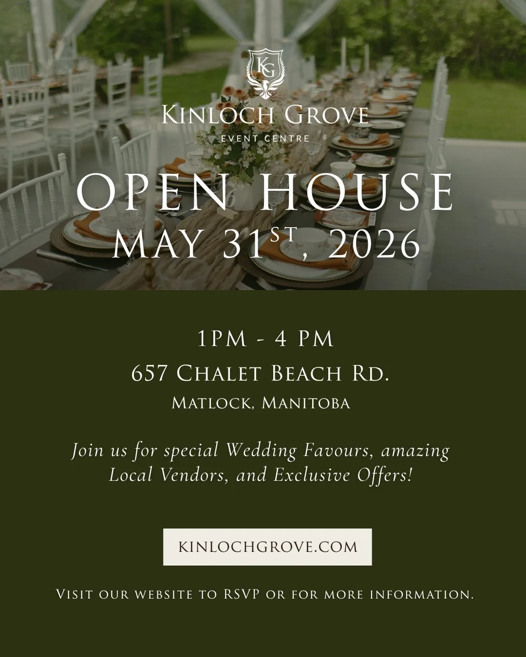 Nestled near Matlock, Manitoba, Kinloch Grove has the perfect balance of rustic charm and modern elegance to provide an unforgettable experience for your wedding.